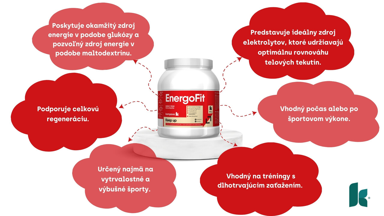 Izotonické nápoje sú praktickým a efektívnym riešením pre športovcov, ktorí chcú optimalizovať svoj výkon a hydratáciu počas fyzickej aktivity. EnergoFit predstavuje vysokoúčinný energetický nápoj. Poskytuje rýchlo dostupný zdroj energie v podobe sacharidu glukózy a pozvoľný zdroj energie v podobe maltodextrínu. Vďaka obsahu aminokyseliny L- glutamín prispieva k regenerácii organizmu. Extrakt zo zeleného čaju pôsobí antioxidačne a chráni organizmus pred voľnými radikálmi.