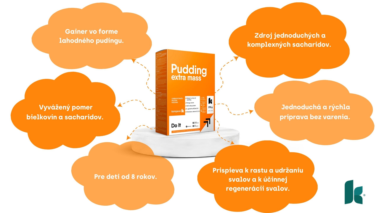Pudding extra mass je jediný gainer vo forme lahodného pudingu s anabolickým účinkom (zvyšovanie sily a rast svalovej hmoty). Má vyvážený pomer bielkovín a sacharidov. S 26% obsahom srvátkovej bielkoviny, glutamínu a BCAA (leucín, izoleucín, valín) prispieva k rastu a udržaniu svalov a k účinnej regenerácii svalov po tréningu. Je skvelým zdrojom jednoduchých a komplexných sacharidov, ktoré doplnia energiu a podporia regeneráciu. Pudding extra mass je vhodný ako posledné sýte jedlo pred tréningom.