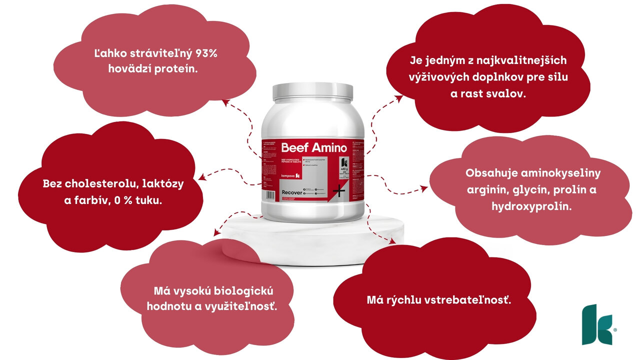Hovädzie peptidy sú skvelým zdrojom esenciálnych a neesenciálnych aminokyselín. Beef Amino obsahuje v optimálnom pomere aminokyseliny arginín, glycín, prolín a hydroxyprolín. Tieto aminokyseliny zabezpečujú tvorbu kolagénu nevyhnutného pre zdravie šliach, väzív, spojivových tkanív, srdcového svalu a všetkých vnútorných orgánov. Zároveň obsahujú prírodný kreatín, železo, zinok, fosfor, vitamíny skupiny B a vitamíny E a A.
