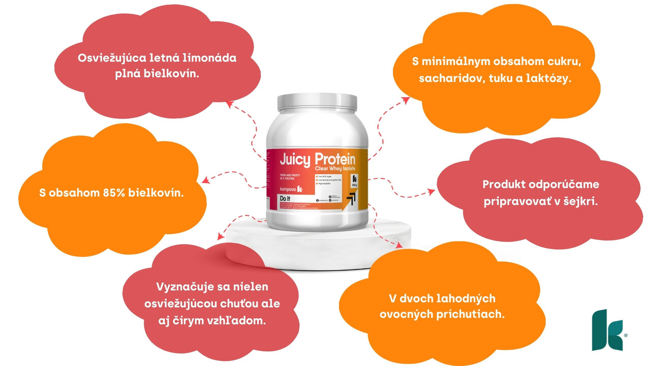 Juicy Protein s obsahom 85 % proteínu ponúka kvalitné bielkoviny vo forme osviežujúcej ovocnej limonády. Neobsahuje husté mliečne zložky, no i napriek tomu dodáva organizmu potrebné bielkoviny. Juicy Protein sa vyznačuje nie len osviežujúcou chuťou ale aj čírym vzhľadom. Popri konvenčných „mliečnych“ proteínoch, akými sú napríklad klasická vanilka alebo čokoláda, môžu teraz športovci siahnuť po ľahkom nápoji, ktorý má zároveň vysoké hladiny leucínu a BCAA na podporu udržiavania svalovej hmoty a lepšiu regeneráciu.