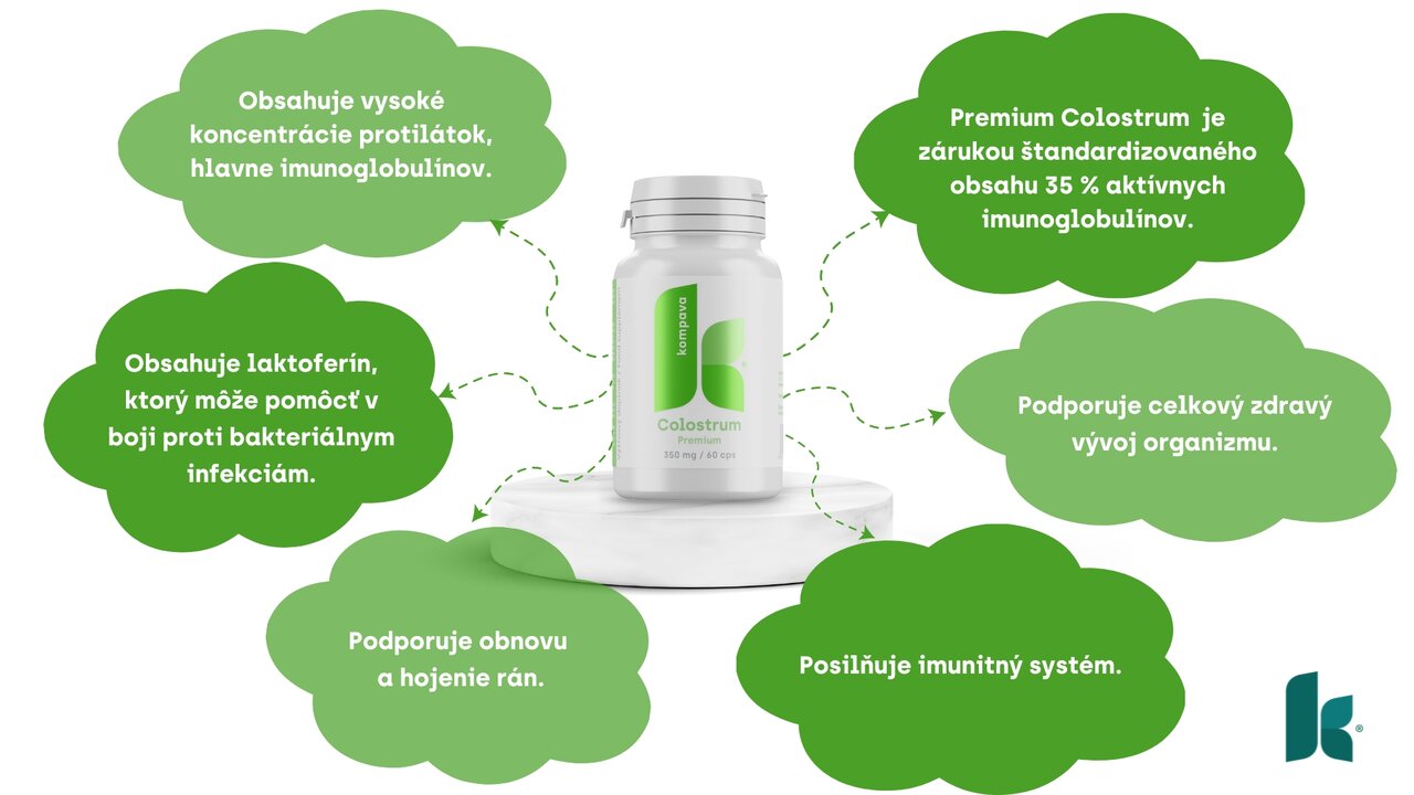 Kolostrum (mledzivo) je výnimočná nutričná látka, ktorá slúži ako prvá potrava všetkým cicavcom prvých pár hodín hneď po narodení. Kolostrum dodáva perfektnú kombináciu imunitných a rastových látok, ktoré zabezpečujú podporu imunity a výživu pre celkový zdravý vývoj organizmu. Premium Colostrum obsahuje vysokokvalitné bovinné - kravské kolostrum, ktoré je vyrábané šetrným nízko-teplotným procesom, ktorý zabraňuje denaturácii (rozpadu) imunoglobulínov, ale zároveň zachováva vysokú mikrobiologickú kvalitu a bezpečnosť.