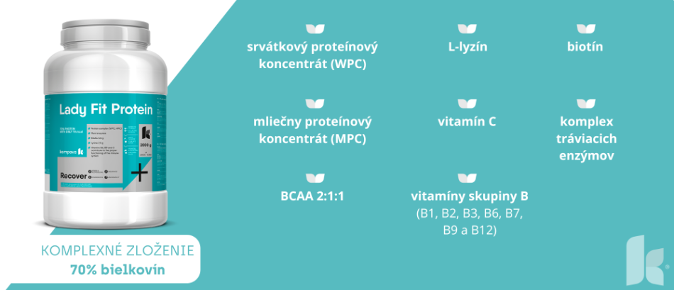 Lady Fit Protein je zložený z vysoko kvalitného srvátkového a mliečneho proteínového koncentrátu. Komplex bielkovín je obohatený o tráviace enzýmy, a tak je proteín ľahko stráviteľný - nespôsobuje žiadne tráviace ťažkosti, nafukovanie či plynatosť. Jedna dávka obsahuje až 5,52 g BCAA, ktoré slúžia na podporu regenerácie svalstva. Starostlivosť o zovňajšok zahŕňa aj starostlivosť o vlasy či nechty, preto sme do Lady Fit Protein pridali biotín, ktorý prispieva k udržaniu ich zdravia. V zdravom tele, zdravý duch. Aby sme vaše zdravie podporili, do Lady Fit Protein sme pridali aminokyselinu L-lyzín, ktorá posilňuje imunitný systém.