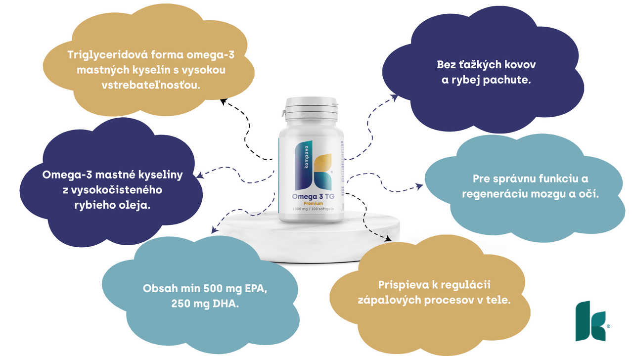 Omega 3 TG Premium obsahujú omega-3 mastné kyseliny EPA a DHA, ktoré sú prirodzenou súčasťou stravy z morských zdrojov. EPA je zložka, ktorá sa podieľa na rôznych procesoch v organizme, vrátane reakcií súvisiacich so zápalovými mechanizmami. DHA je dôležitou súčasťou štruktúry mozgu, očí a bunkových membrán. Ich pravidelný a dostatočný príjem sa spája s lepšou regeneráciou, stabilitou ciev, normálnou reakciou imunitného systému a podporou psychickej odolnosti. Práve preto je príjem kvalitnej formy omega-3 v podobe TG koncentrátu dôležitý ako aktívna výživová podpora pri zvýšenej záťaži či počas obdobia rastu a starnutia. Omega-3 TG forma predstavuje optimálny spôsob, ako zabezpečiť účinný a dobre tolerovaný prísun týchto esenciálnych látok v každodennom režime.