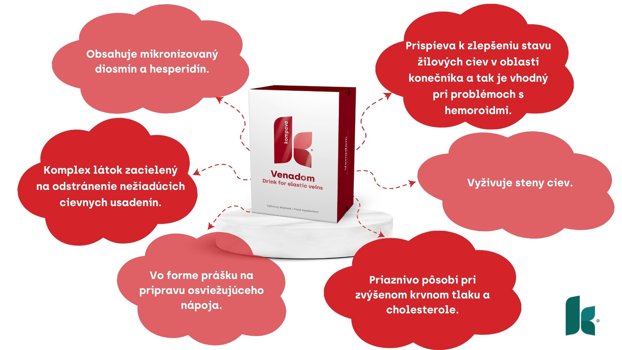 Užívaním výživového doplnku Venadom, navyše, prirodzene doplníte do organizmu tekutiny, ktoré sú nevyhnutné pre vyživené a zdravé cievy. Produkt obsahuje vysoký podiel proteínov, minimum tukov a žiadny pridaný cukor. Je vhodný pre diabetikov, celiatikov i ľudí s laktózovou intoleranciou.