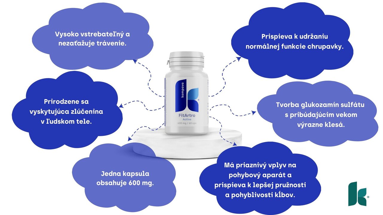 Glukozamín sulfát je prirodzene sa vyskytujúca zlúčenina v ľudskom tele a je hlavnou zložkou chrupavky. Jeho úlohou je stimulovať činnosť chrupavkových buniek (chondrocytov) k tvorbe stavebných zložiek chrupavky (glykozaminoglykány a proteoglykány). Týmto spôsobom môže prispieť k udržaniu normálnej funkcie chrupavky. Ide o najdôležitejšiu látku, ktorou môžete začať pri ochrane kĺbov a väzív. Glukozamín sulfát je vysoko vstrebateľný a nezaťažuje trávenie, má priaznivý vplyv na pohybový aparát a prispieva k lepšej pružnosti a pohyblivosti kĺbov. Tvorba glukozamín sulfátu s pribúdajúcim vekom je tvorba výrazne klesá.