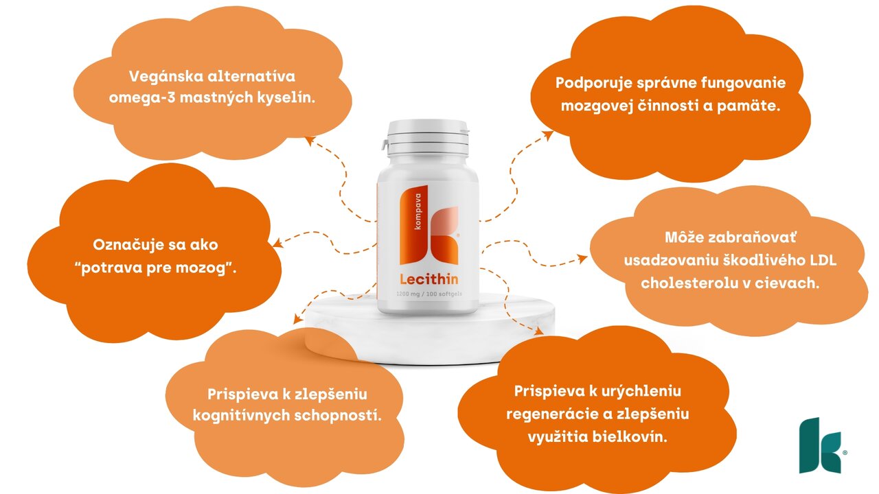 Lecitín je tvorený prevažne cholínom a inozitolom. Cholín je významnou súčasťou acetylcholínu, základného neurotransmitera (prenášača nervových vzruchov), ktorý je nevyhnutný pre správnu funkciu mozgovej činnosti a pamäte. Lecitín tiež zabraňuje usadzovaniu škodlivého LDL cholesterolu v cievach, a pôsobí tak preventívne proti kardiovaskulárnym chorobám, prispieva k odbúravaniu alkoholu v pečeni a tým môže znížiť poškodenia pečene, posilňuje pamäť a sústredenie.